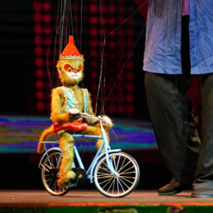 在数十根丝线的操控下,木偶钟馗拎起酒壶,将酒灌入嘴中,打了个嗝后,又捧起酒坛一口气喝光。木偶小猴憨态可掬,伴着音乐声弹起吉他。“通过细线就能让木偶抓稳酒壶、弹起吉他、甚至能骑车,太精妙了!”观众们惊叹不已。