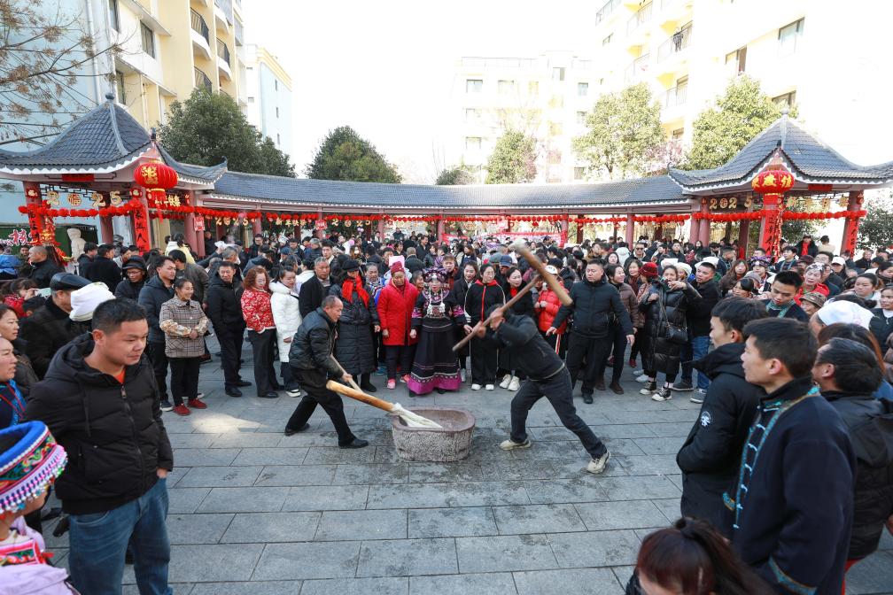 当日,贵州省黔南布依族苗族自治州都匀市小围寨街道思源社区群众欢聚一堂,一起跳竹竿舞、芦笙舞,观看舞龙、舞狮表演,参与打糍粑、趣味游戏等活动,一起吃团圆宴,共迎幸福年。