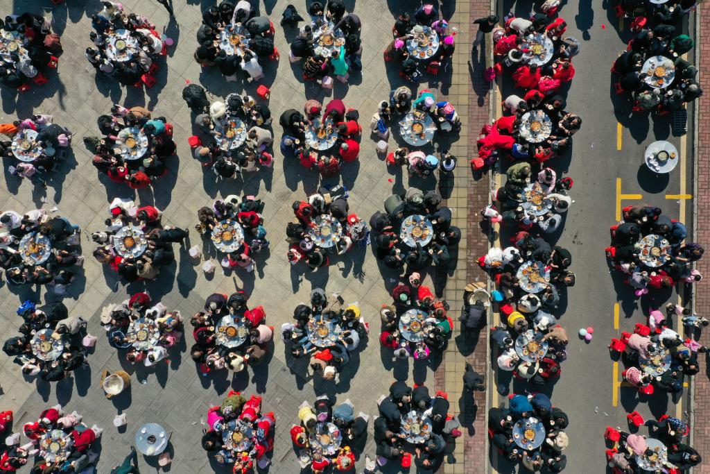 1月12日,群众在贵州省黔南布依族苗族自治州都匀市小围寨街道思源社区一起吃团圆宴(无人机照片)。