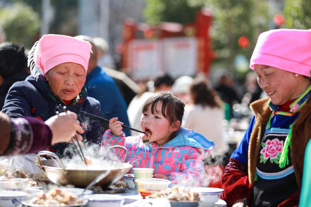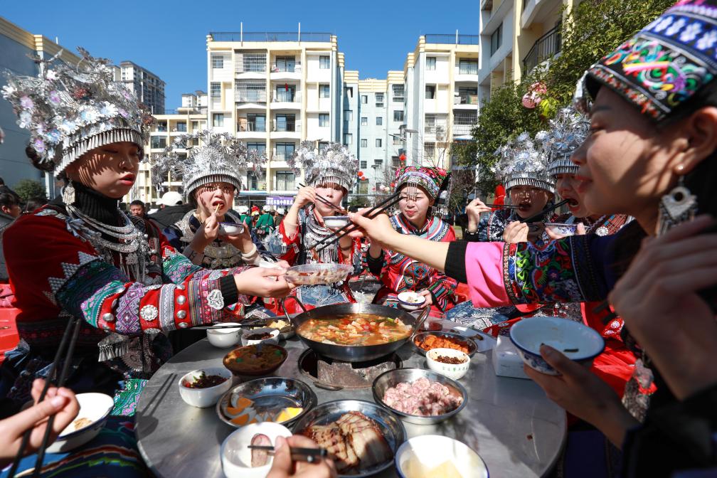 1月12日,群众在贵州省黔南布依族苗族自治州都匀市小围寨街道思源社区一起吃团圆宴。