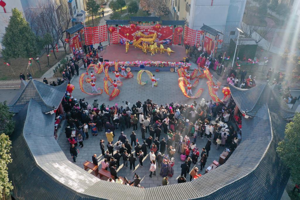 1月12日,群众在贵州省黔南布依族苗族自治州都匀市小围寨街道思源社区观看舞龙表演(无人机照片)。
