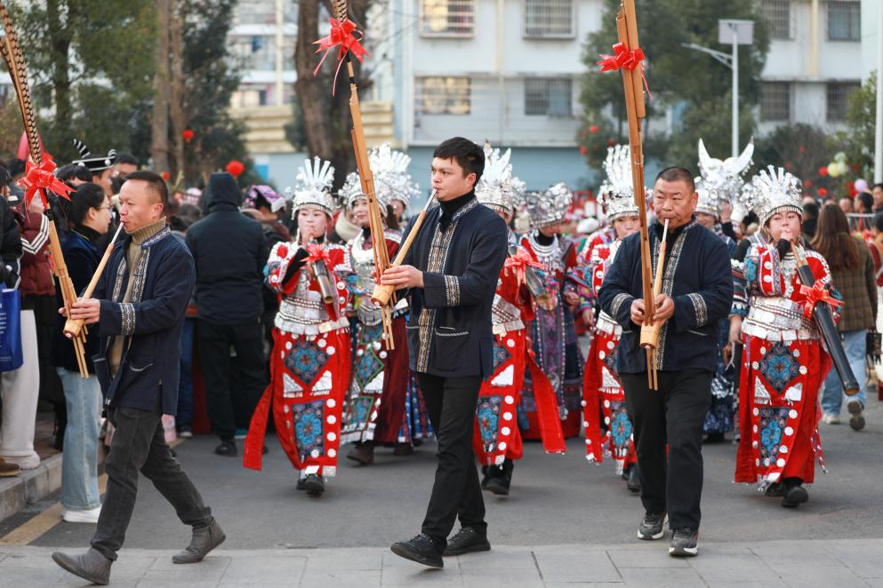 1月12日,群众在贵州省黔南布依族苗族自治州都匀市小围寨街道思源社区表演芦笙舞。
