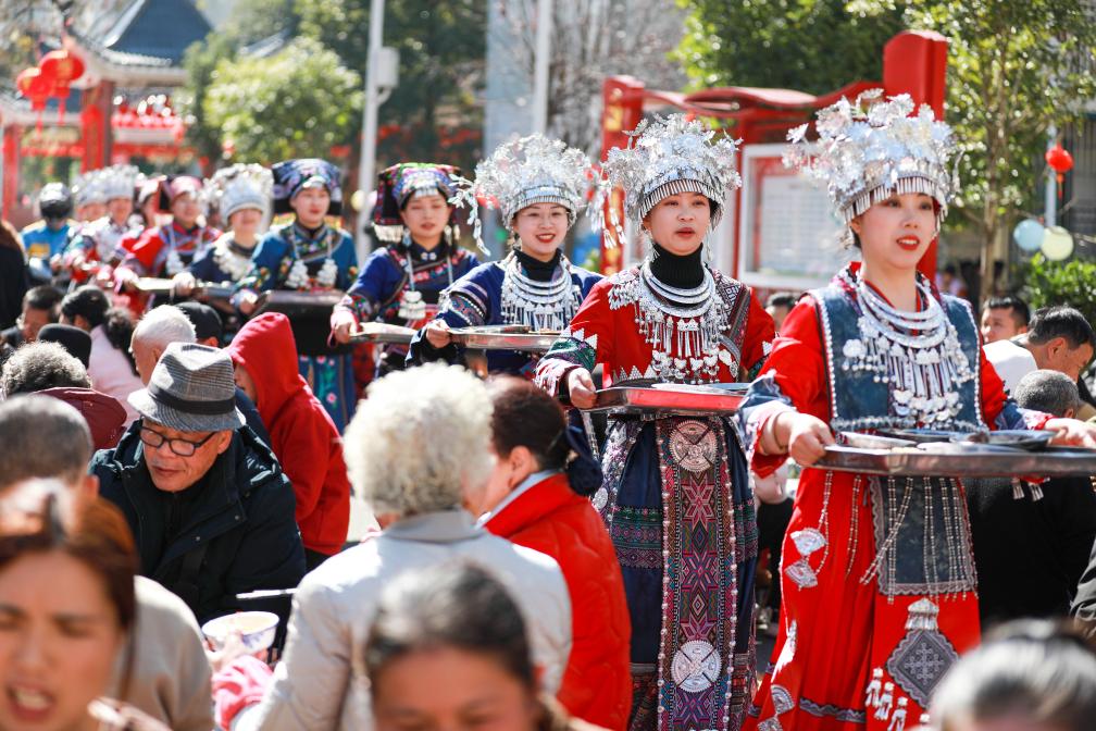1月12日,在贵州省黔南布依族苗族自治州都匀市小围寨街道思源社区,穿着民族服饰的工作人员为参与活动的群众上菜。