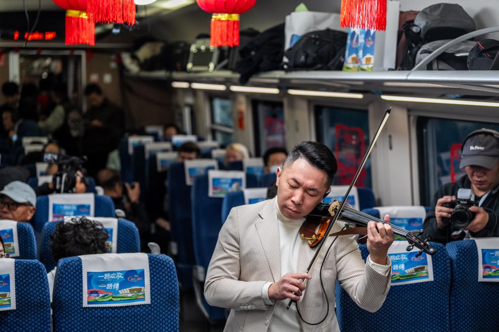 “这条铁路已经成为连接中老两国人民情感的纽带。”一曲小提琴演奏的《象王行》结束,从事导游工作18年的许炆楷接过麦克风,跟大家分享中老铁路的故事:中老铁路通车后,去老挝旅游的中国游客大幅增加,早上在昆明吃米线,感受春城魅力,晚上就可以在万象品尝米粉,体验别样风情。