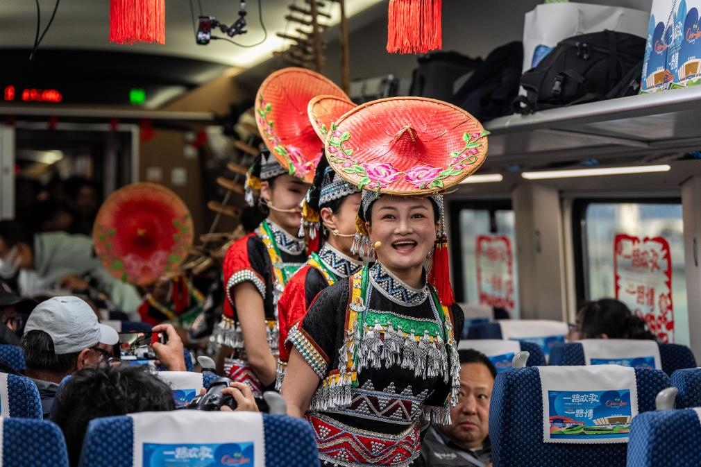 走进2号车厢,窗花鲜艳夺目,红灯笼映入眼帘,喜庆气氛感染着每一位旅客。“‘一路欢歌一路情’中老铁路春节文化主题活动十分特别。”云南省委宣传部副部长冯俊扬说,活动以春运首日中老铁路行进中的列车为舞台,端出精彩的跨国演出“大餐”,围绕中老铁路建设发展路、幸福路、友谊路,以快闪、文艺演出、世界遗产地宣介、非遗展示和主题故事分享等形式,讲好“跨国春运”暖心故事,奏响中老友谊之歌。