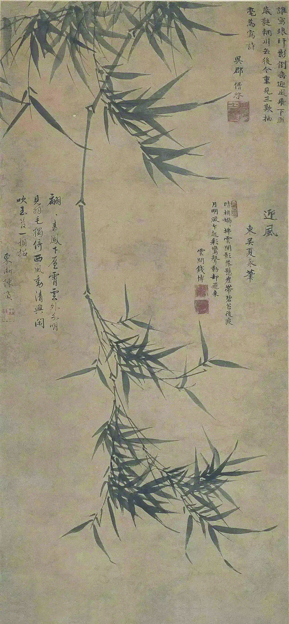 明代画坛,夏昶的《墨竹图》在竹画中堪称独树一帜的存在。这幅画描绘了一竿倒垂竹,生动刻画了竹子在风中摇曳、柔韧倔强的情形,有“枝活叶叶动”的效果,呈现出一幅生机盎然的蓬勃景象。