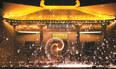 在甘肃省敦煌市鸣沙山月牙泉景区广场,民间艺人进行打铁花表演。张晓亮摄(新华社发)