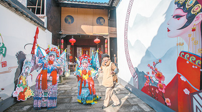 在浙江省金华市郑店村婺剧非遗主题馆,村剧团老师给游客指导婺剧基本动作。杨梅清摄(人民图片)