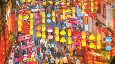 新春佳节临近,海南省海口市博爱路年货一条街张灯结彩,吸引了众多市民游客。张茂摄(人民图片)