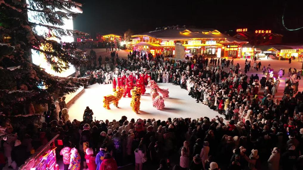 夜幕低垂,雪乡的热闹却刚刚拉开序幕。造型各异的花车缓缓穿梭在银装素裹的世界;狮舞伴着喧天的锣鼓,跳跃于皑皑白雪之上;游客们在雪地里蹦迪如火如荼、尽情摇摆。不远处,绚丽的激光束交织出各种图案,五彩斑斓的烟花绽放在雪乡的夜空。