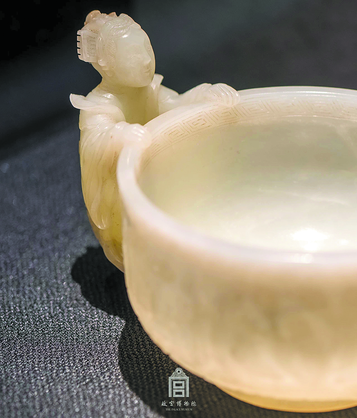 乾隆款白玉礼乐图杯这一展品,堪称当时风雅与意趣的典范。玉杯仿宋代白玉礼乐图杯而制,以女子形象为耳。女子头部插梳,双手扶杯沿,坐于自杯底沿杯壁上升的云朵之上,展现出一种超凡脱俗的美感。