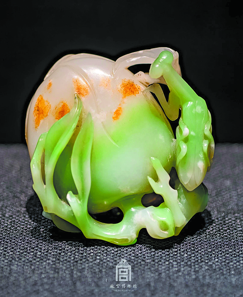 “玉之巧”单元展出的清宫赏玩用玉均为供品鉴、摩挲与娱乐的玉器珍品。这些展品反映出乾隆皇帝在政务之余,常与玉为伴,对玉石有着深厚的喜爱之情。其中一件白玉巧雕螳螂蝠桃尤为引人注目:其上半部分雕琢了一只展翅飞翔的蝙蝠,下半部分则巧妙利用玉料自身的翠绿色,雕琢出桃叶与枝梗,并在桃枝上圆雕一只螳螂,生动逼真。黄英说:“清宫旧藏和田玉中,这种白玉中带有鲜艳绿色的玉料极为罕见。”