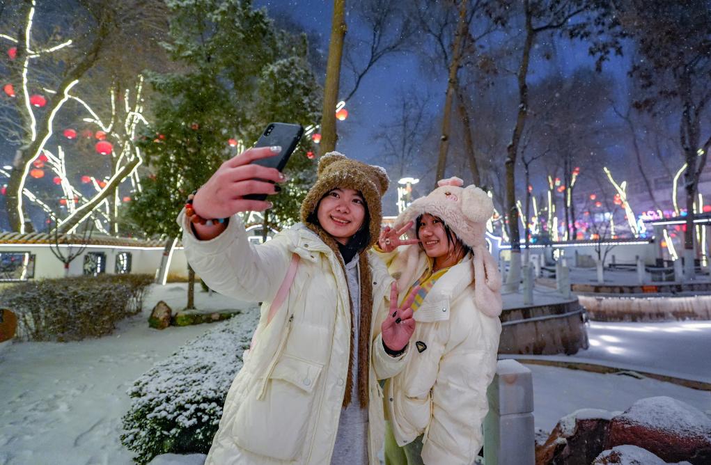 1月24日,游客在宁夏银川宁园公园拍照留念。