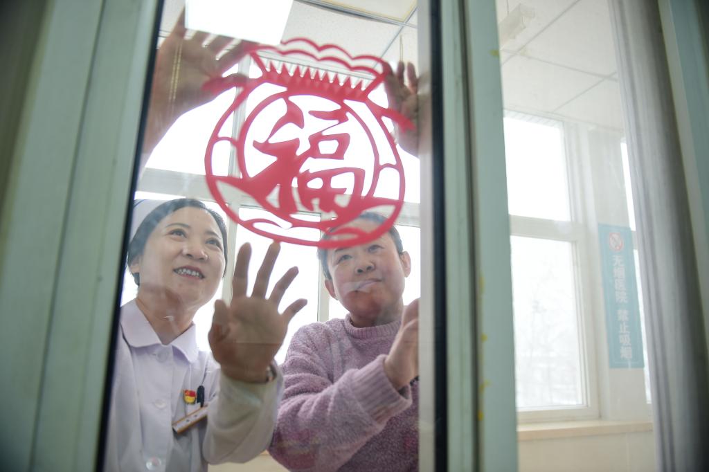 1月26日,河北省沧州市第三医院的医务人员与患者一起贴福字。