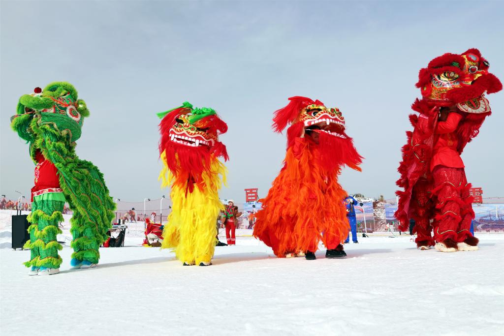 1月26日,民间艺人在湖北省宜昌市夷陵区百里荒滑雪场为游客表演舞狮。