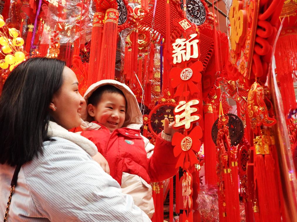 1月26日,在安徽省滁州市来安县,市民带着孩子选购春节饰品。