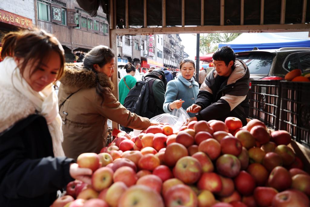 1月26日,人们在重庆黔江区濯水古镇购买苹果。