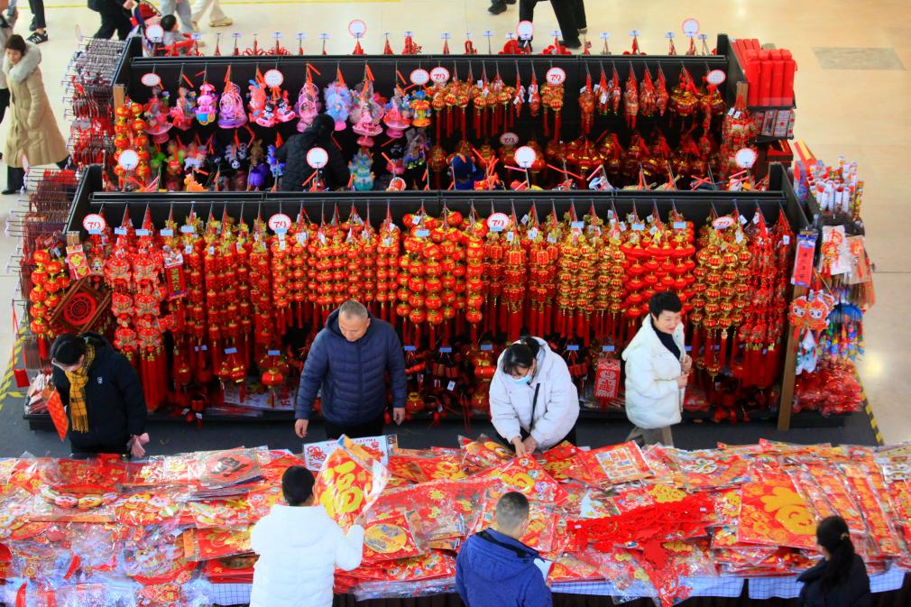 1月26日,人们在山东临沂平邑县一家商场选购节日饰品。