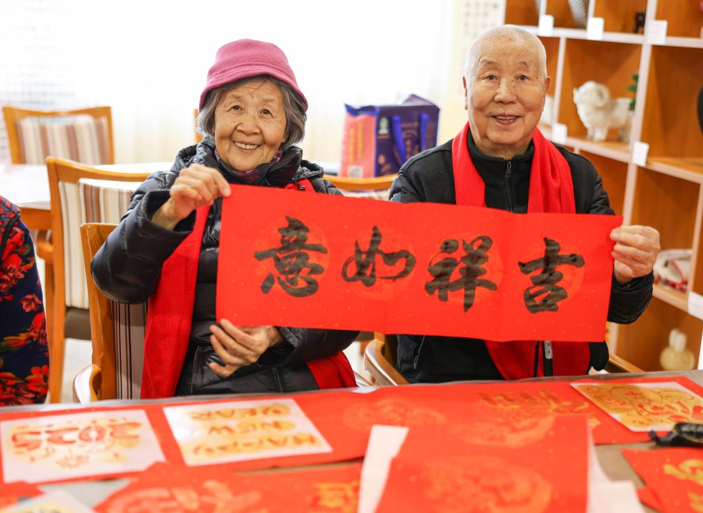 1月26日,老人在山东省荣成市一家老年公寓展示书写的新春祝福。