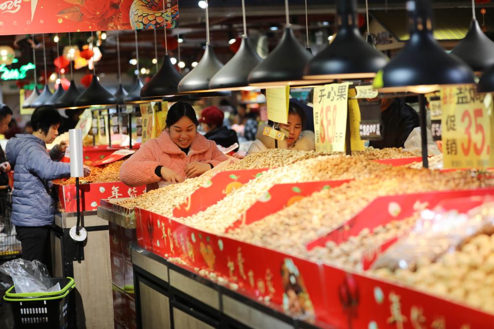 1月25日,人们在湖南永州道县一家超市选购年货。