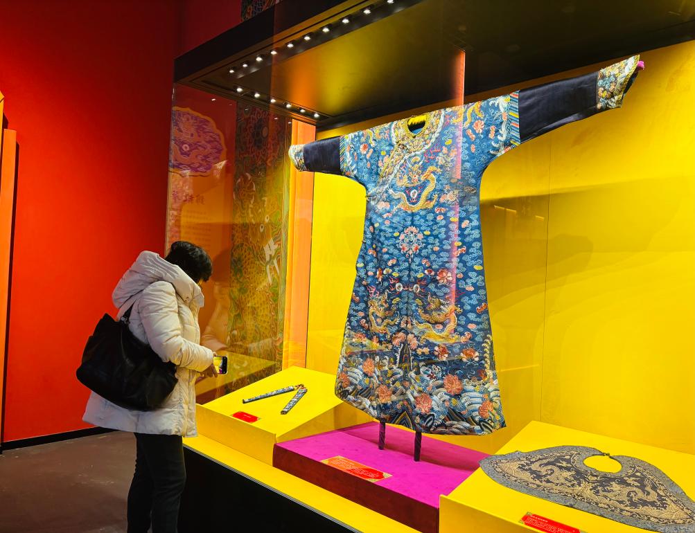 1月26日,观众在展览上观赏蓝地缂丝吉服袍(天津博物馆藏)。新华社记者 周润健 摄