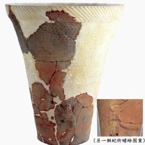 蛇在中国文化中也被视为智慧的象征。展出的蛇衔蟾蜍筒形陶罐,陶罐一面浮雕单只蟾蜍,另一面浮雕蛇衔蟾蜍,蟾蜍作四肢张开惊恐逃跑状,蛇张口衔住蟾蜍右下肢,用力摆动尾部,形象生动逼真。这件陶罐出土于辽宁阜新的查海遗址,该遗址距今约8000年,陶罐上面的图案是我国迄今为止发现最早的蛇纹图案。