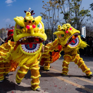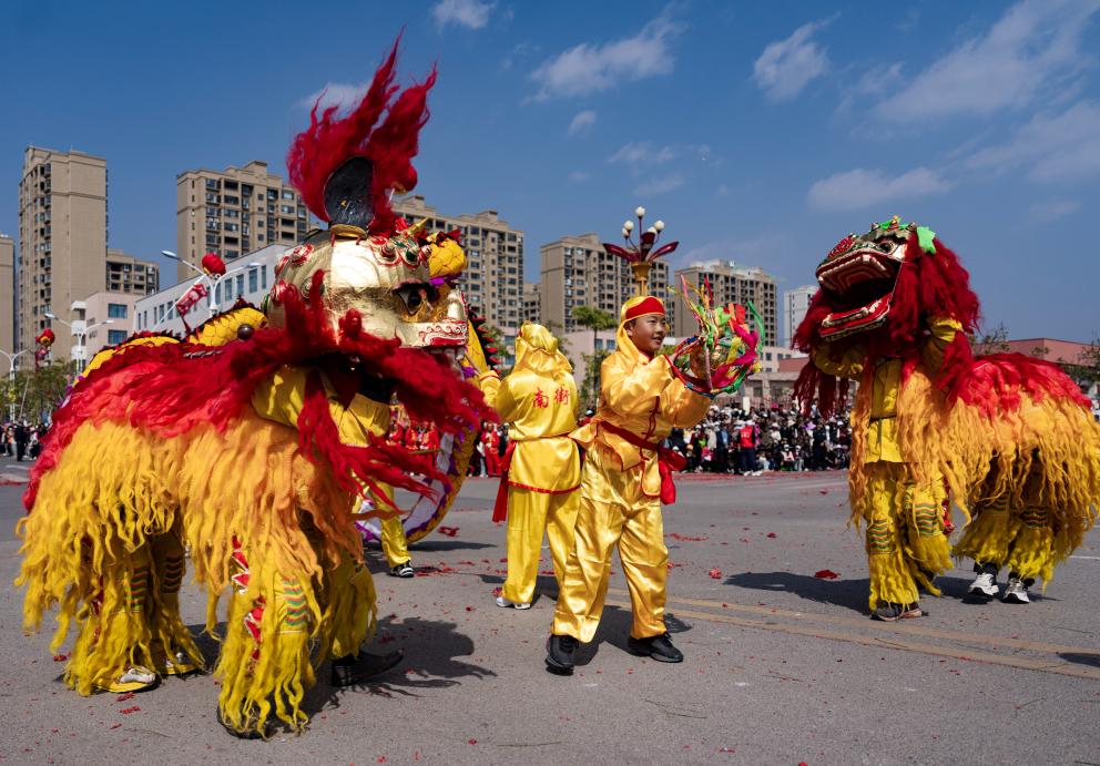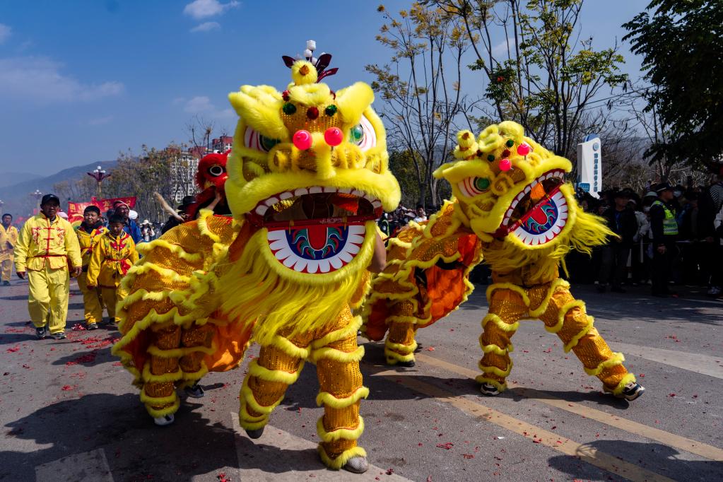 2月6日,人们在南涧县龙灯会上表演舞狮。
