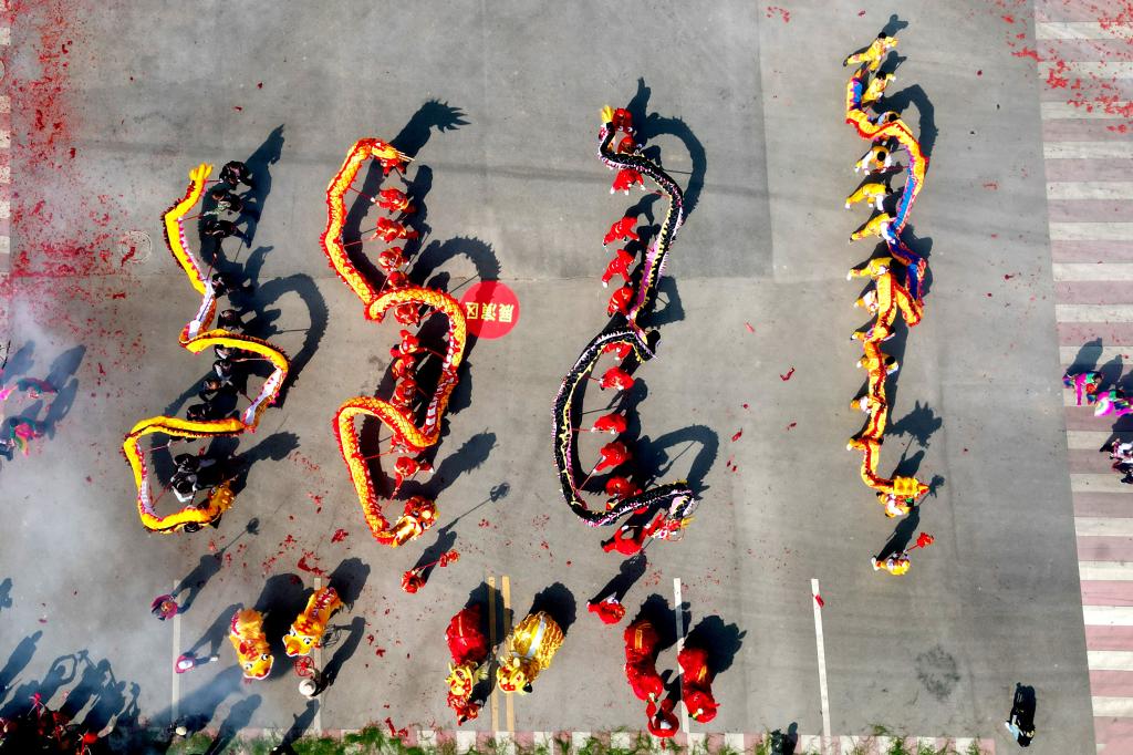 2月6日,人们在南涧县龙灯会上表演舞龙(无人机照片)。