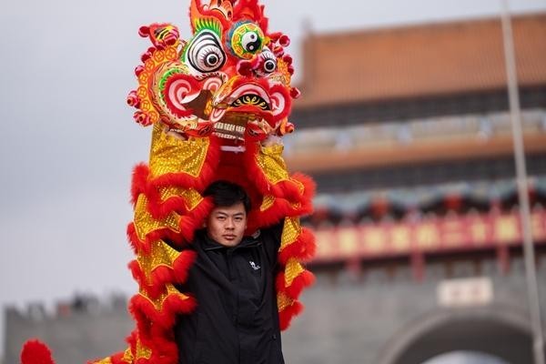 1月29日,云南农业大学大一学生陶柄辰与来自西南大学、云南大学、苏州大学、合肥工业大学等高校的40余名大学生在曲靖市麒麟区南城门广场参加“千人舞麒麟”活动。合肥工业大学 张恒恺/摄