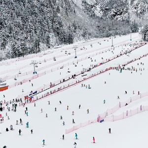 游人在四川省汶川县羌人谷滑雪游玩(2025年1月31日摄) 刘坤摄 / 本刊