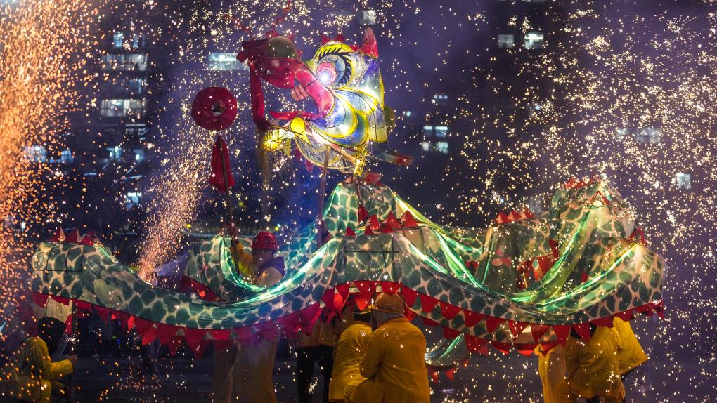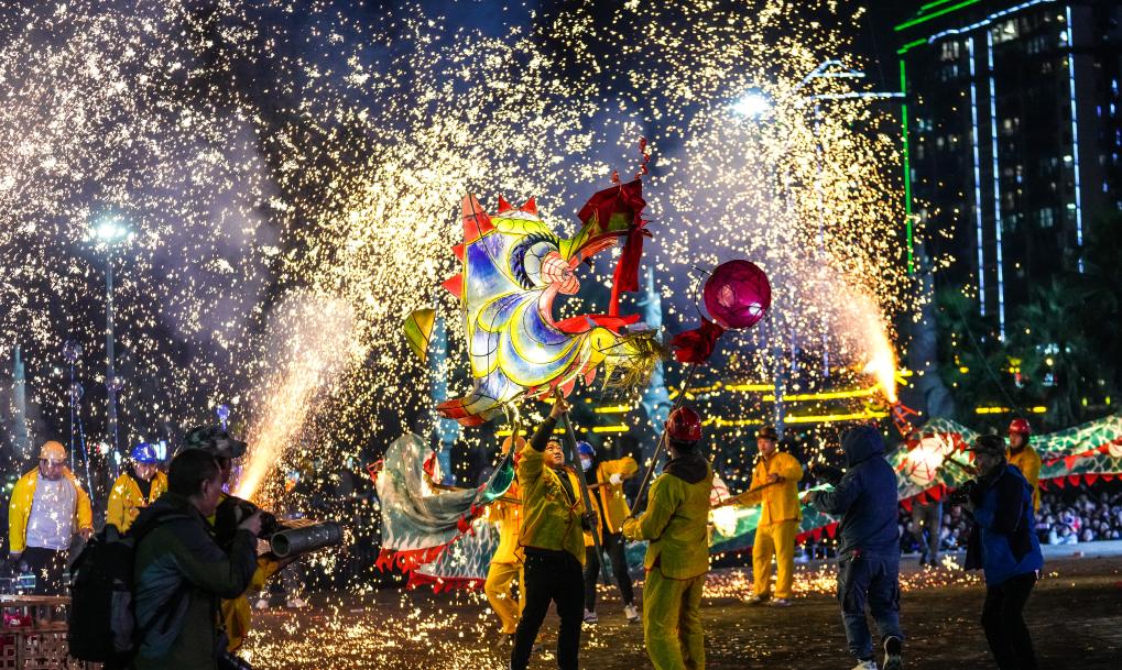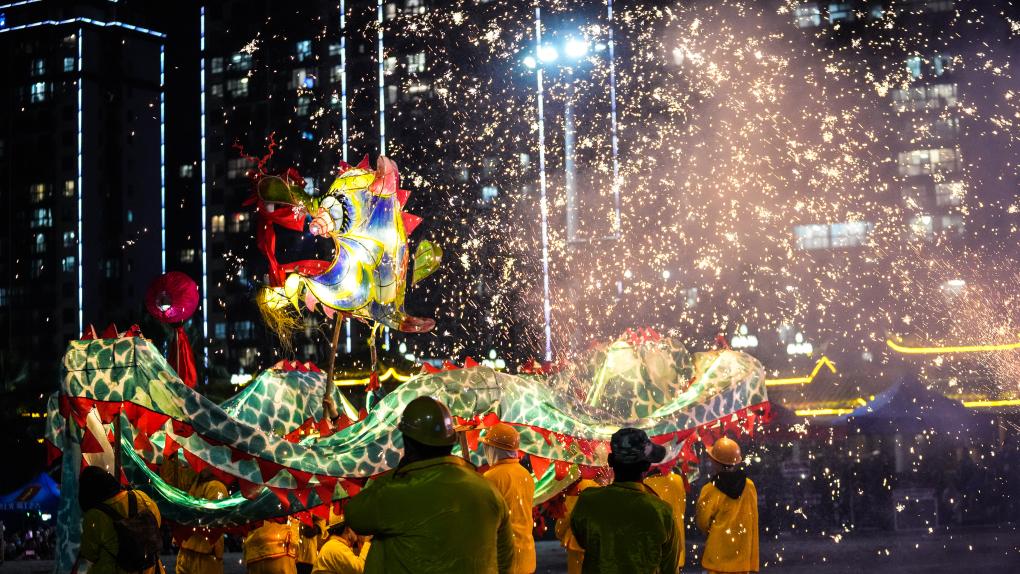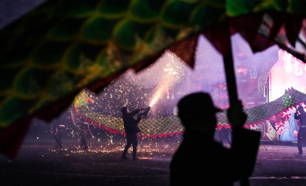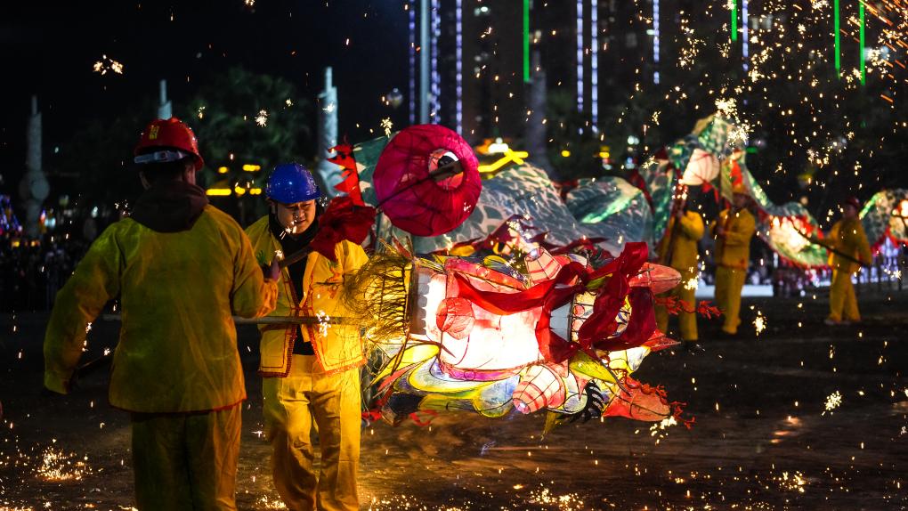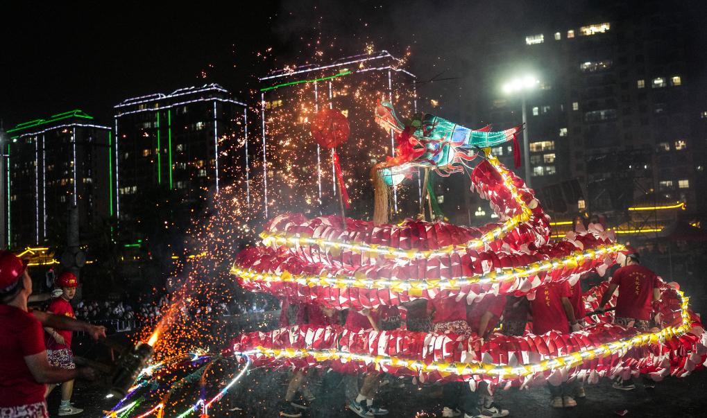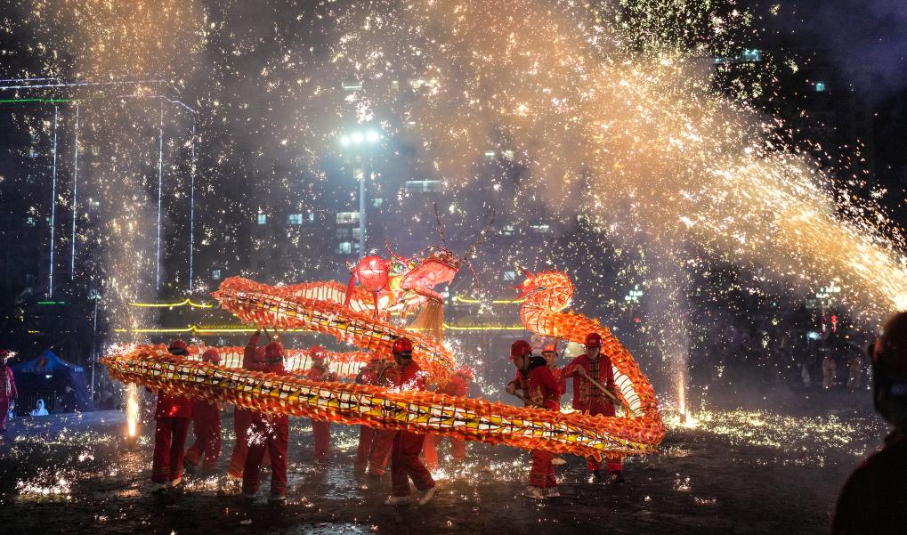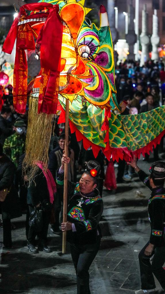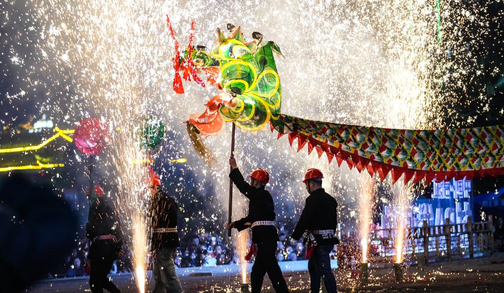 2月11日晚,人们在台江县参加“舞龙嘘花”活动。