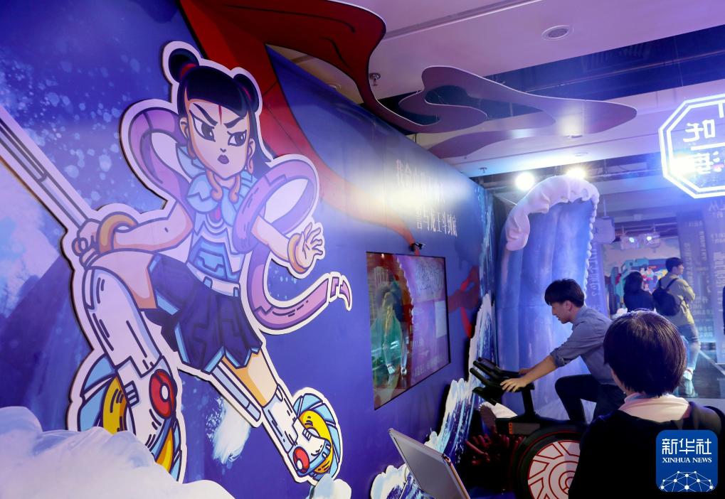 2019年10月17日,预展参观者体验踩动感单车互动游戏,和哪吒的“风火轮”比拼转速。当日,由上海美术电影制片厂、百度和豫园共同打造的“童年英雄AI幻想互动展”在上海豫园华宝楼举行媒体预展。新华社记者 刘颖 摄