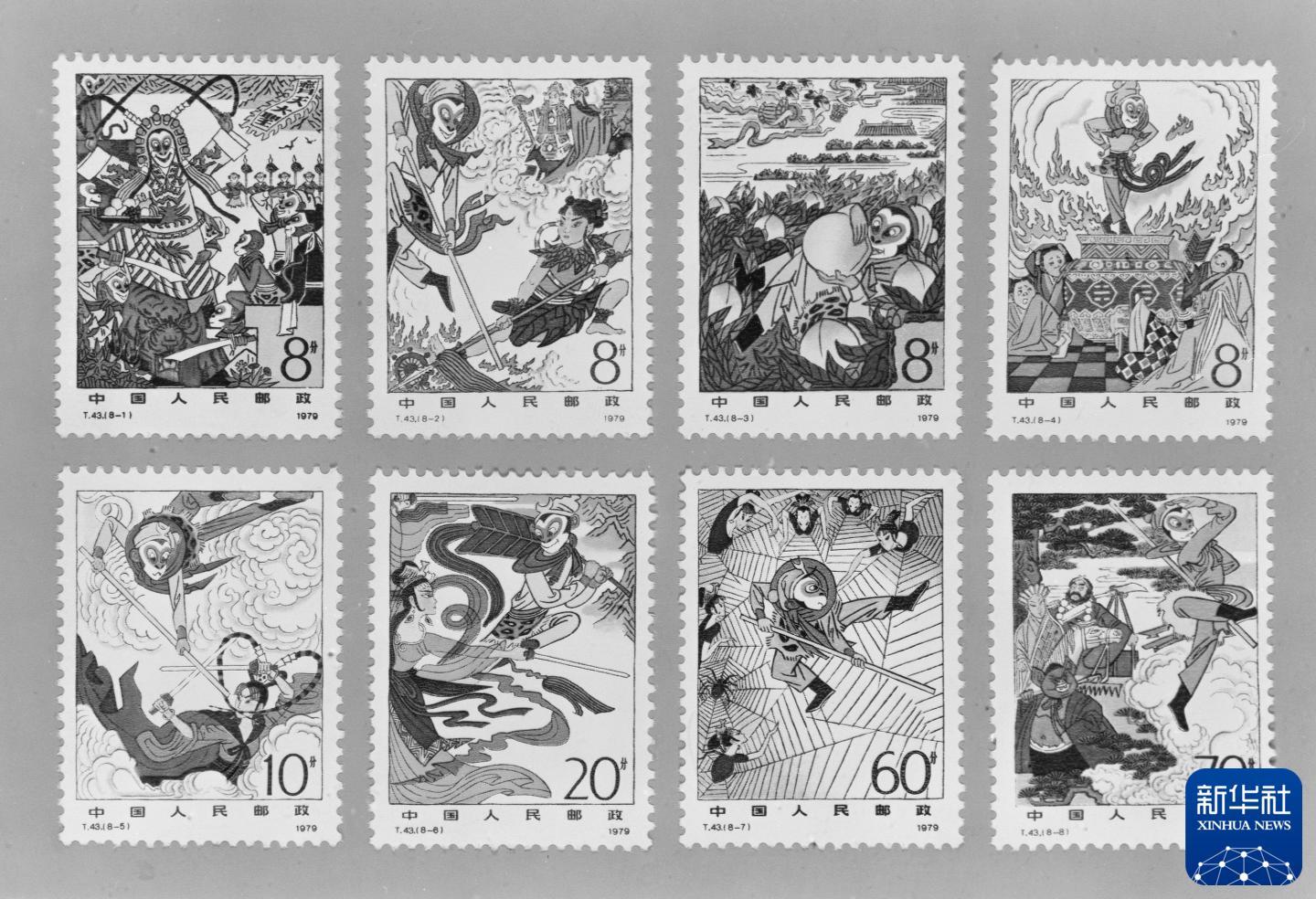 这是1979年12月1日发行的《中国古典小说·西游记》特种邮票一套,共八枚。图案为:水帘洞、战哪吒、蟠桃园、八卦炉(上排自左至右)、打白骨、芭蕉扇、盘丝洞、取经路(下排自左至右)。 新华社发