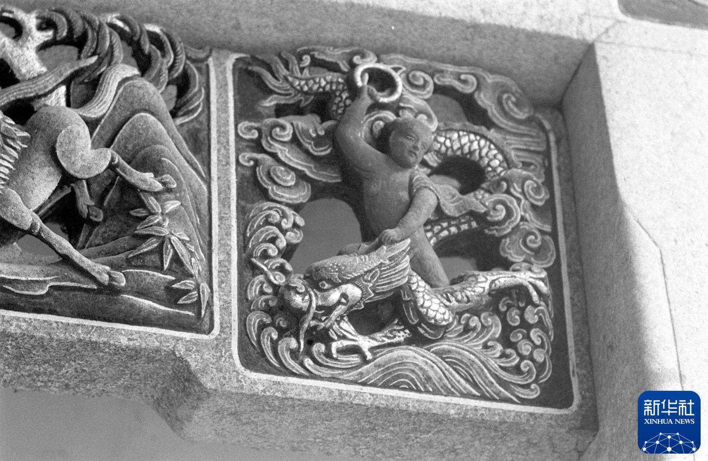 这是1988年拍摄的一幅镶嵌在广东潮阳民居建筑上的石雕作品《哪吒闹海》。新华社记者 陈学思 摄