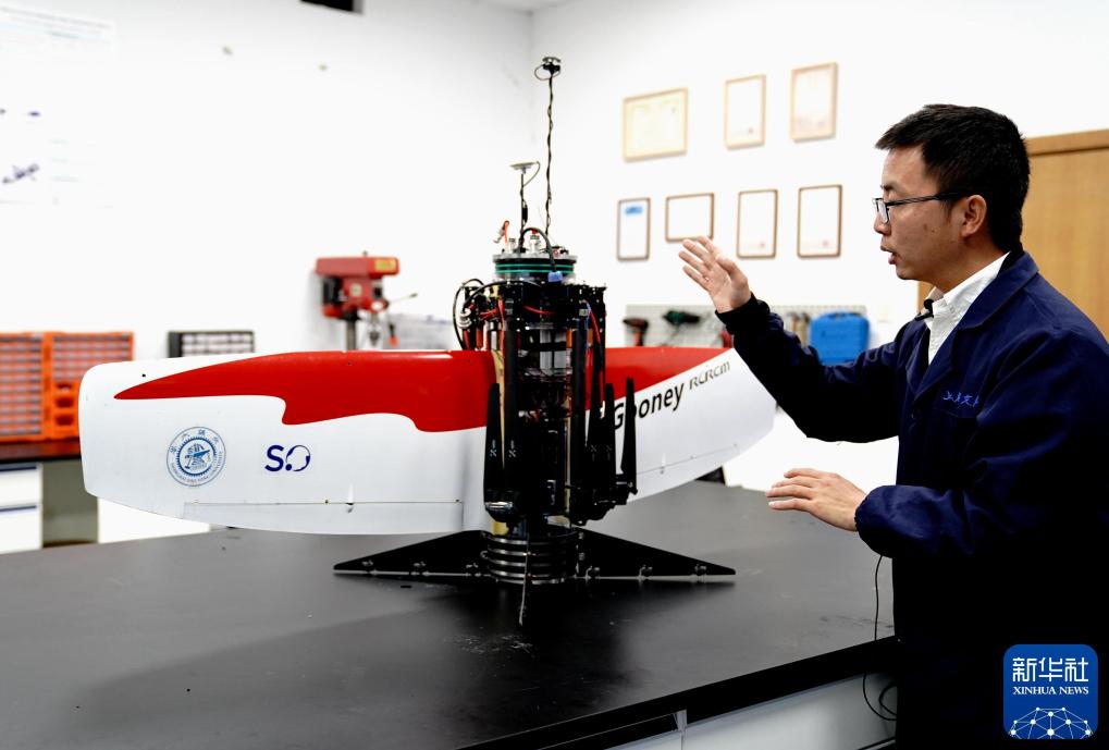 2021年4月1日,上海交通大学海洋学院海洋技术团队曾铮副研究员介绍“哪吒”。新华社记者 张建松 摄2021年
