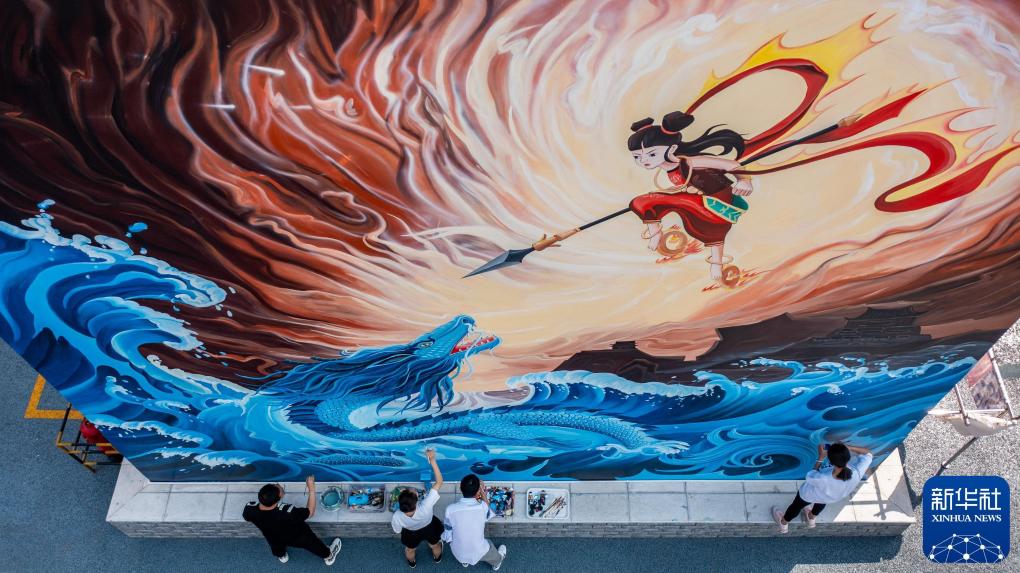 2022年4月29日,在云南省玉溪市红塔区共美家园小区,“墙画师”在给墙画《哪吒闹海》补色。新华社记者 胡超 摄