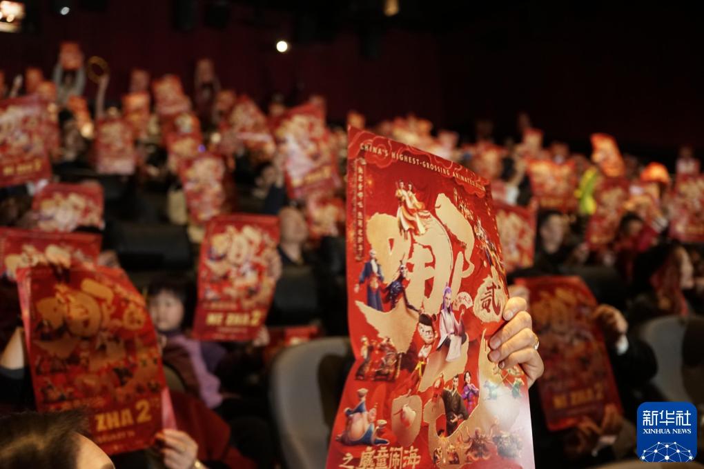 2025年2月8日,人们在美国洛杉矶举行的《哪吒之魔童闹海》北美首映礼上举起电影海报。新华社发(曾慧摄)