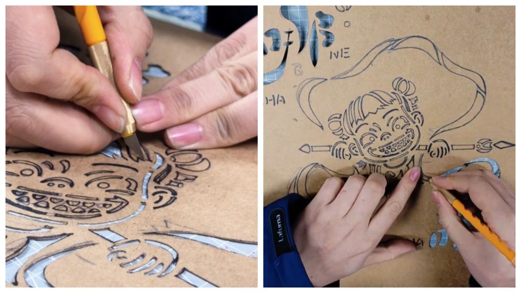 蓝印花布设计,“有图必有意,有意必吉祥”。过去,蓝印花布图样多采用盘长纹、蝙蝠纹、万字纹、花鸟图样等寓意吉祥的传统纹样,这次用蓝印花布印染技艺塑造“哪吒”这一全新形象,也是一次不小的挑战。