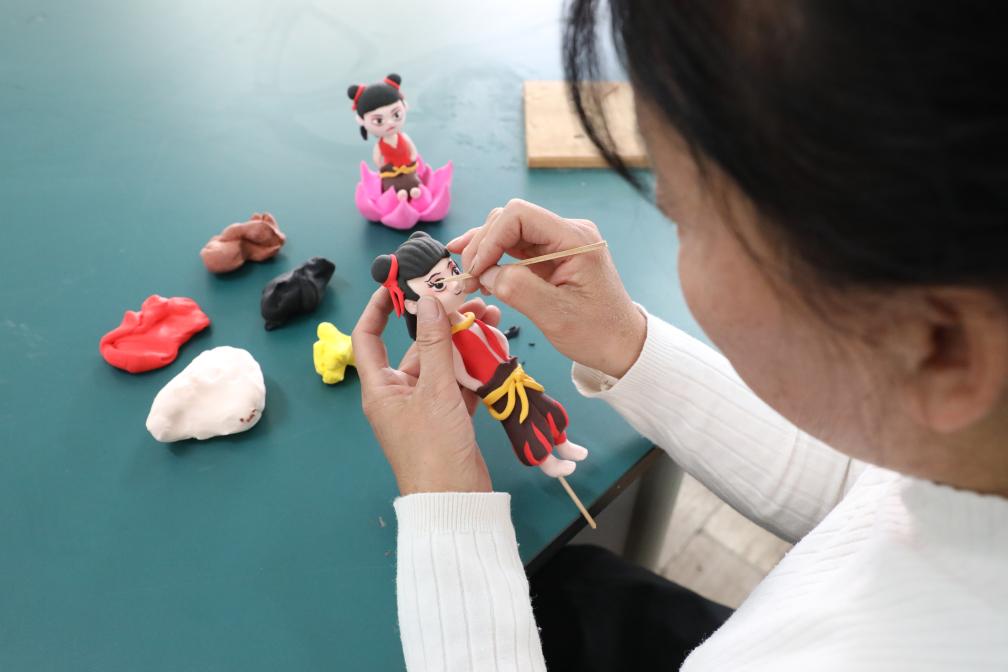 2月20日,泥塑艺人杨爱华在山东省滨州市的一所小学创作哪吒主题泥塑。
