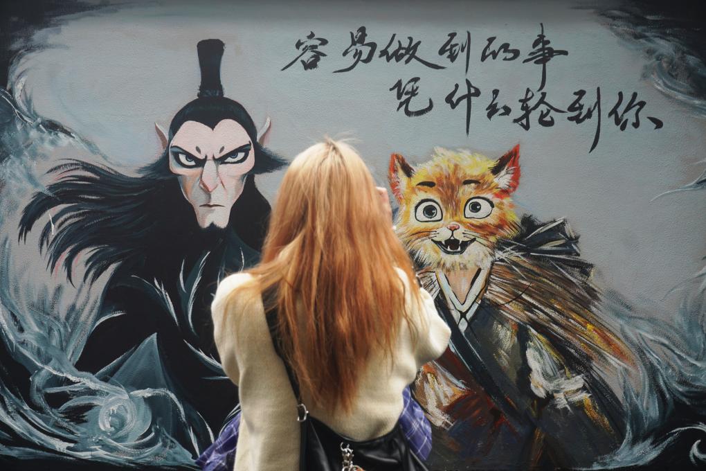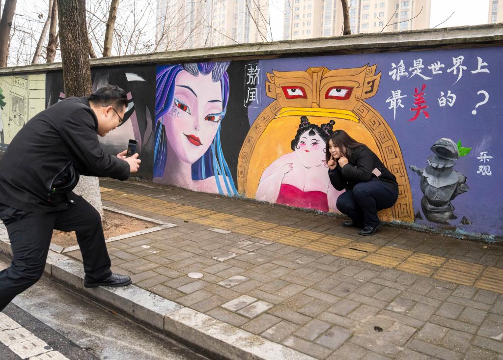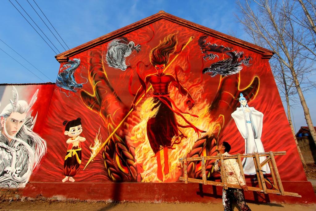 2月23日,市民在长沙市岳麓区岳麓街道五星村观看哪吒主题墙绘。