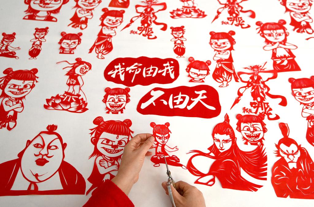 2月13日,河北省邯郸市一名剪纸艺人在创作哪吒主题剪纸作品。