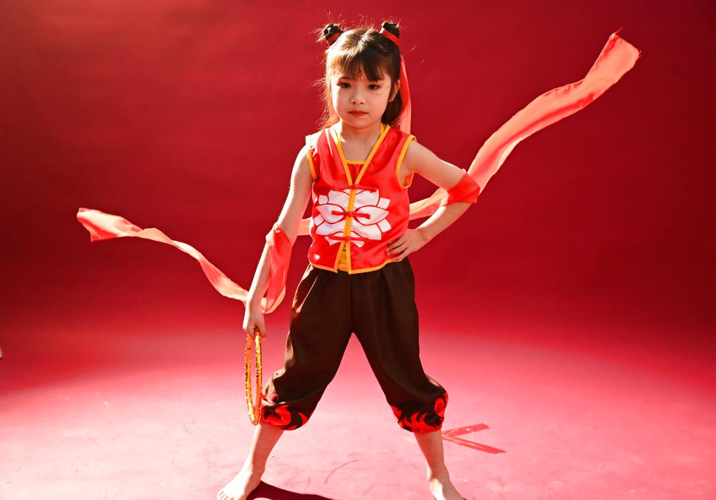 2月22日,小朋友在山东省聊城市的一家儿童影像馆拍摄哪吒主题写真。