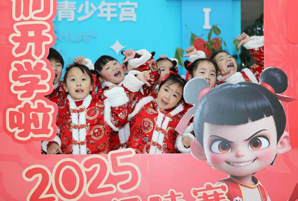 2月23日,在重庆市永川区青少年活动中心,孩子们与哪吒卡通形象合影。