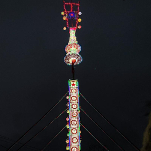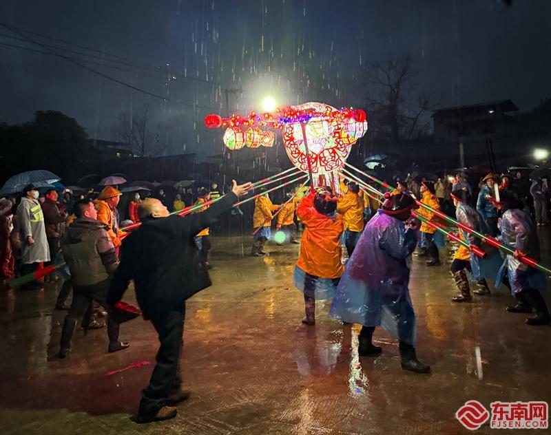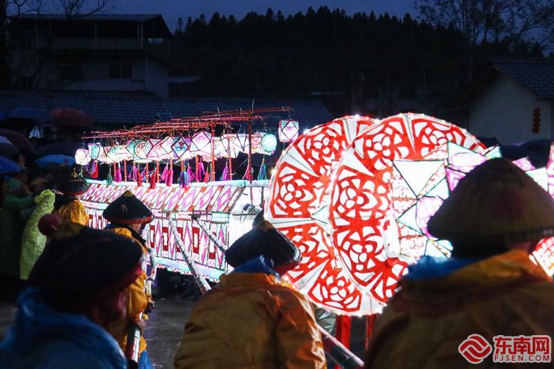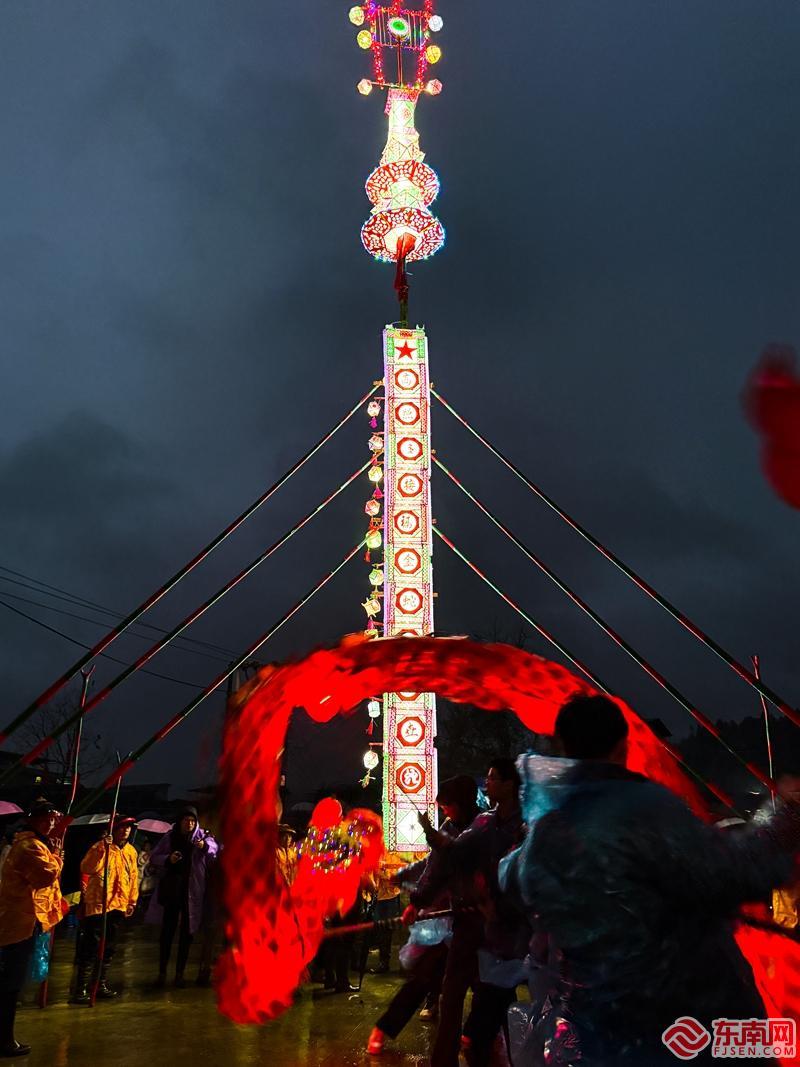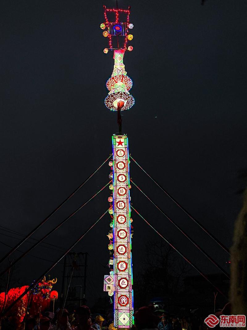竖高照灯是建阳区崇泰街道彭墩村的传统习俗,每逢正月二十五,当地村民都会开展高照灯表演,通过地方特色民俗表演的形式,表达对新年的祝福与期盼。据悉,高照灯由12组灯箱和3组旋转顶灯相叠而成,形体似塔,高达13米,上挂36盏神态各异的花篮子灯装饰的小花灯,不同的花灯,也有着不同的尺寸。其工艺精巧,气势磅礴,因此享有闽北“花灯之王”美誉。