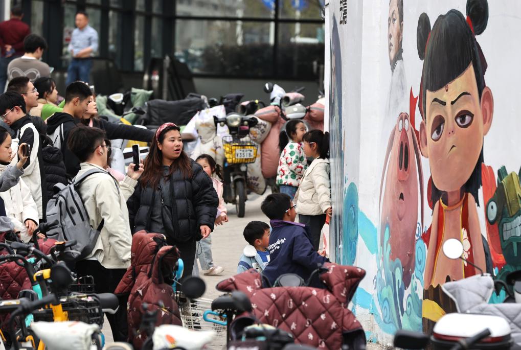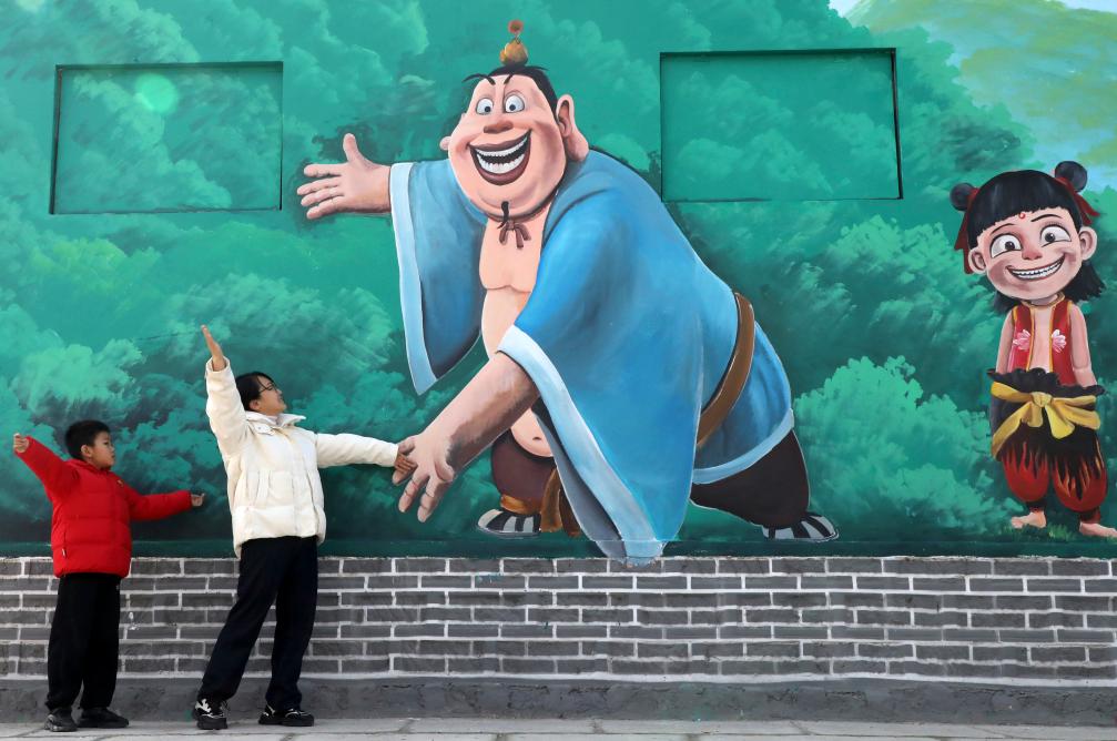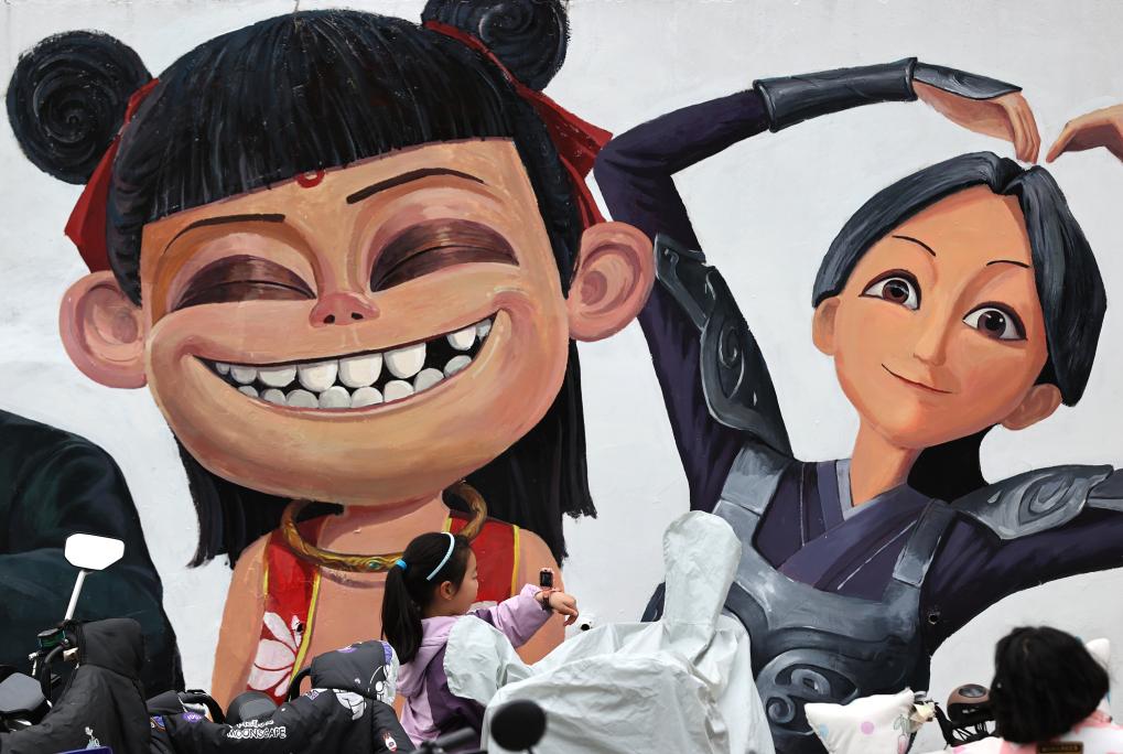 3月1日,人们在山东省滨州市博兴县乔庄镇东冯村的哪吒主题墙绘前拍照。