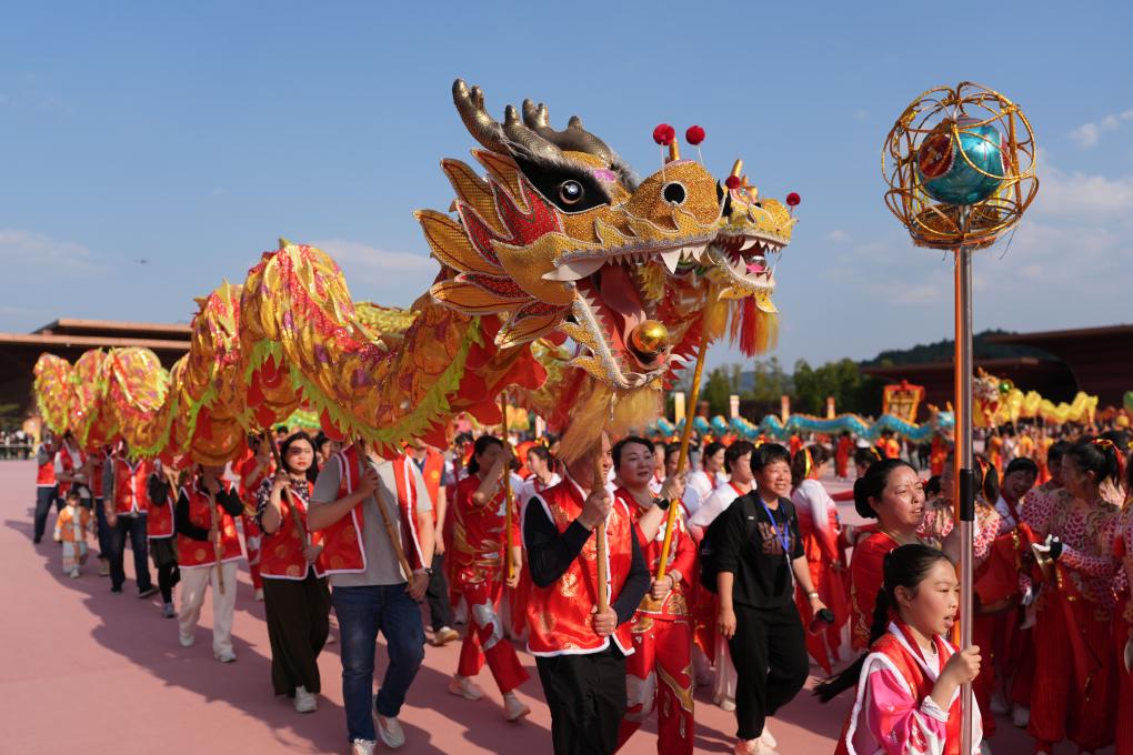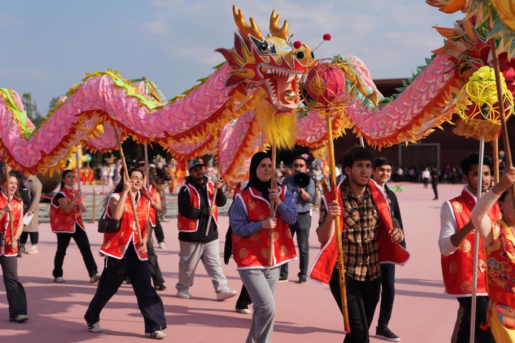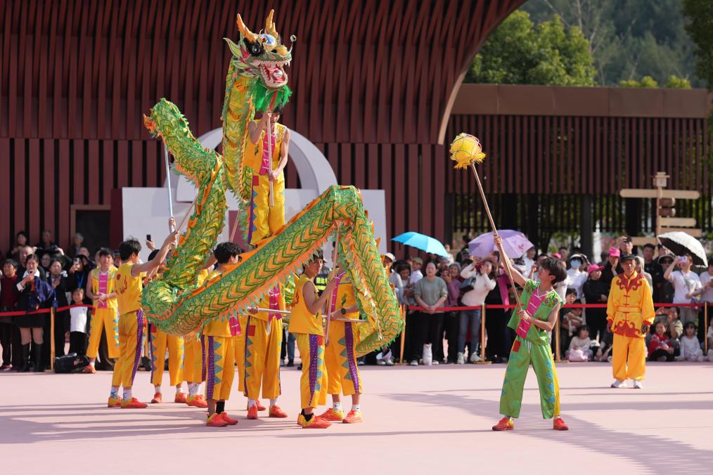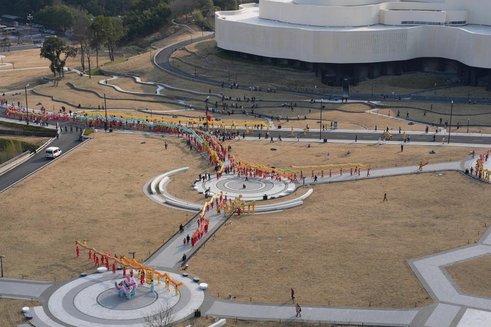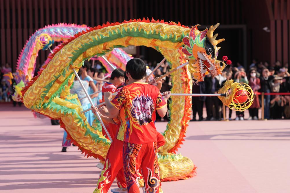 3月1日,由外国友人组成的奉化布龙队伍在广场巡游表演。