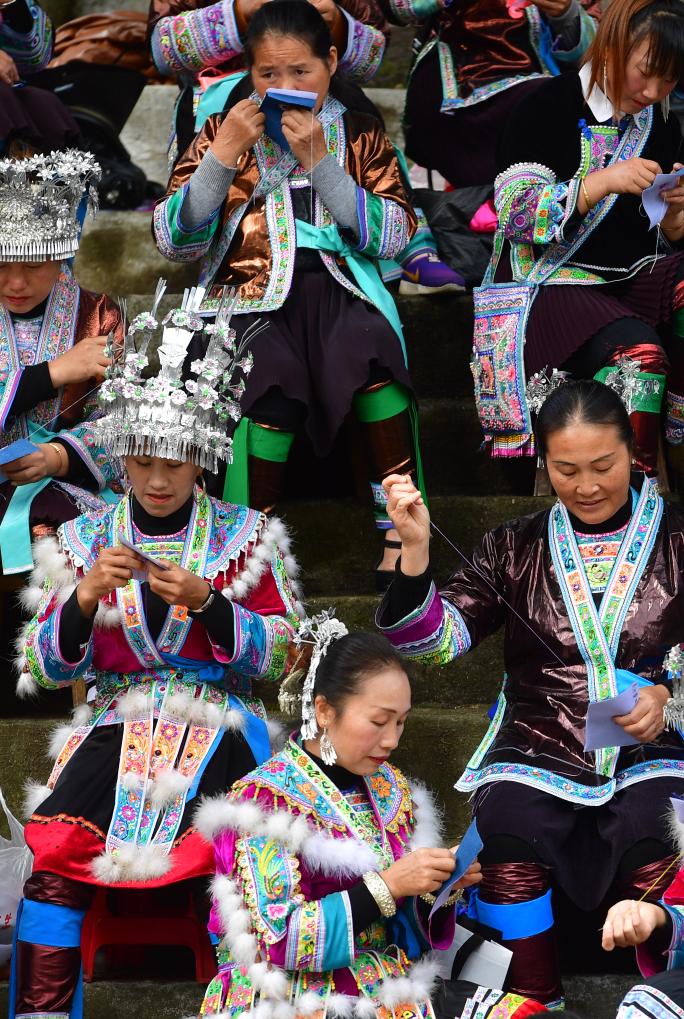 在广西柳州市融水苗族自治县杆洞乡党鸠村,杨洪英(最下方)在刺绣比赛中(2019年10月18日摄)。