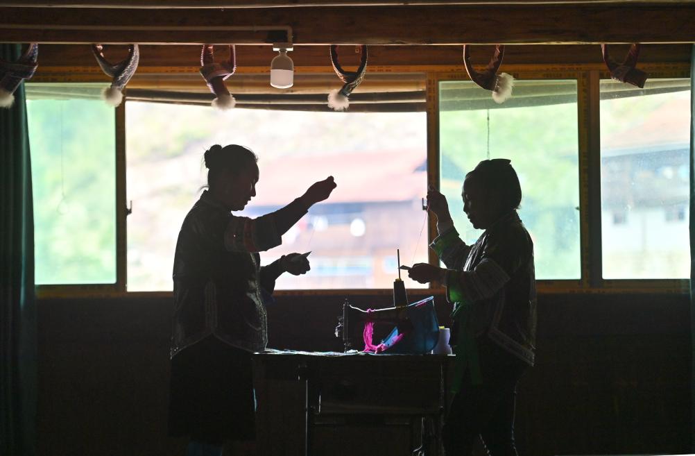 在广西柳州市融水苗族自治县杆洞乡杆洞村,杨洪英(右)在苗衣制作基地工作(2月27日摄)。