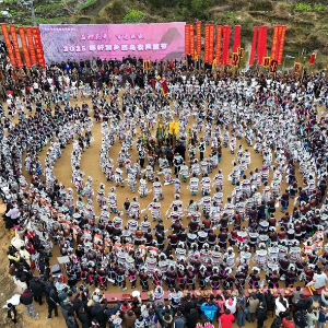 在广西柳州市融水苗族自治县杆洞乡百鸟衣芦笙坡会,各族群众一起跳芦笙踩堂舞。其中有不少人的苗族服饰是杨洪英制作的(2月5日摄)。新华社发(欧明熙 摄) 记者:黄孝邦