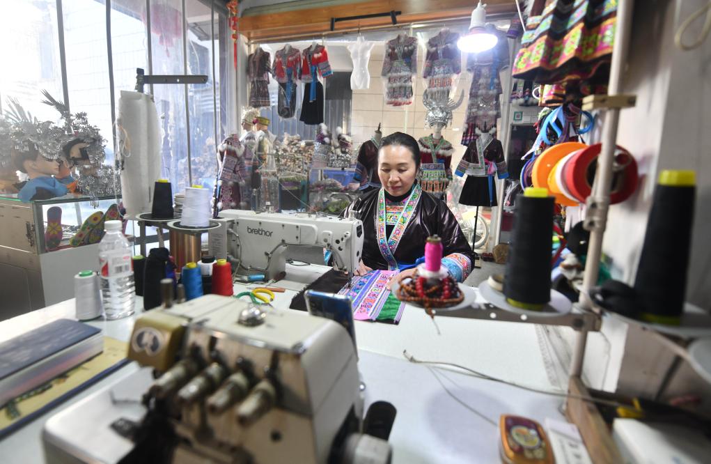 在广西柳州市融水苗族自治县杆洞乡杆洞村,杨洪英在苗衣制作基地工作(3月4日摄)。